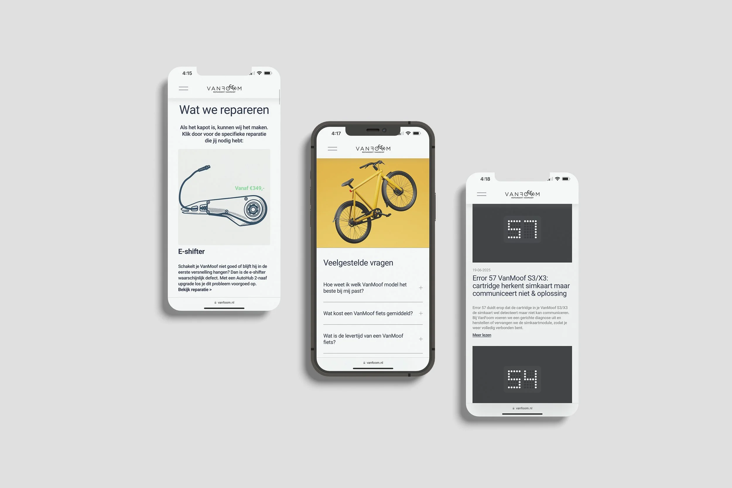 VanFoom had de expertise in huis, maar online werd deze nog onvoldoende gevonden. De uitdaging was om: beter vindbaar te worden in Google, een sterke branding voor de website neer te zetten en bezoekers door te laten stromen naar reparaties of productpagina’s